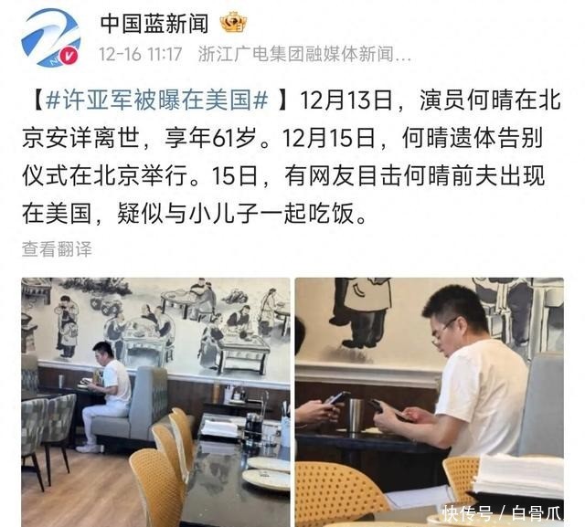 更让人意想不到的是,就在何晴葬礼刚结束的第二天,就有IP地址显示在美国的网友发文称,当天中午在洛杉矶一家餐厅偶遇许亚军。