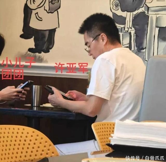 从网友拍摄的照片显示,许亚军身穿白色T恤、白裤和白鞋,戴着金丝眼镜,专注地看着手机,而旁边坐的正是小儿子。