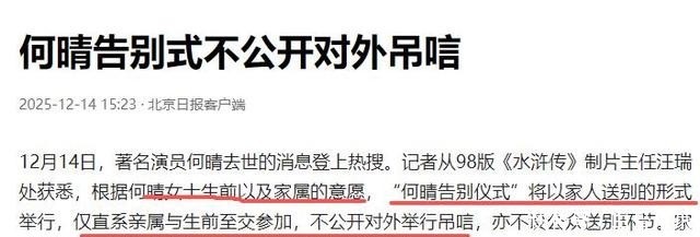 据家属透露,何晴在生前明确表示不希望大张旗鼓地办葬礼,从12月13日去世到12月15日举行告别仪式,中间仅隔了两天时间,整个过程也极为低调。
